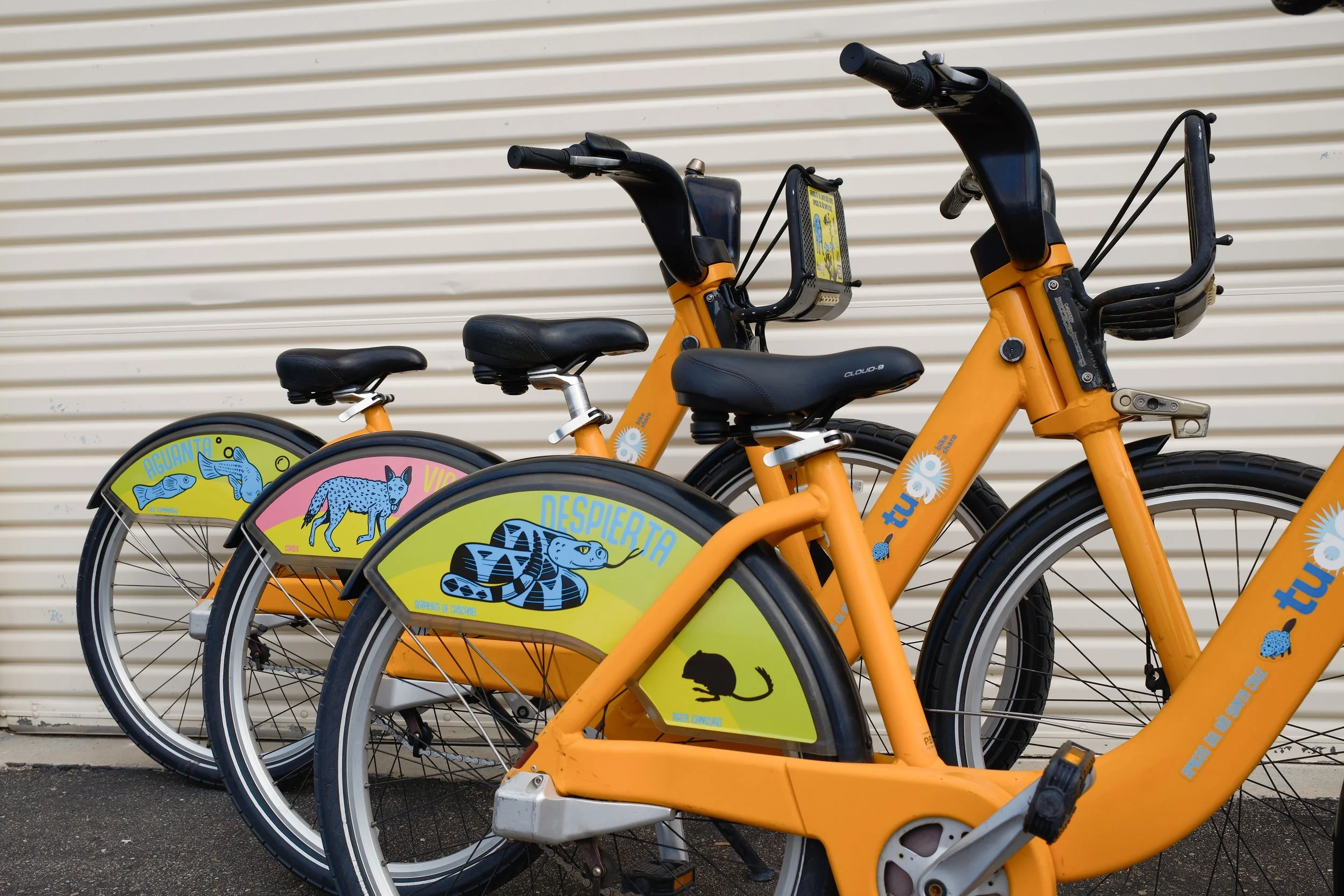 Inspired by wildlife living in and along the Santa Cruz river. These designs are bright for safety in traffic and playful to encourage engagement from many riders. One side of the bike is in English and the other in Spanish sharing a word of inspiration for each creature and also labeling them as an education component.